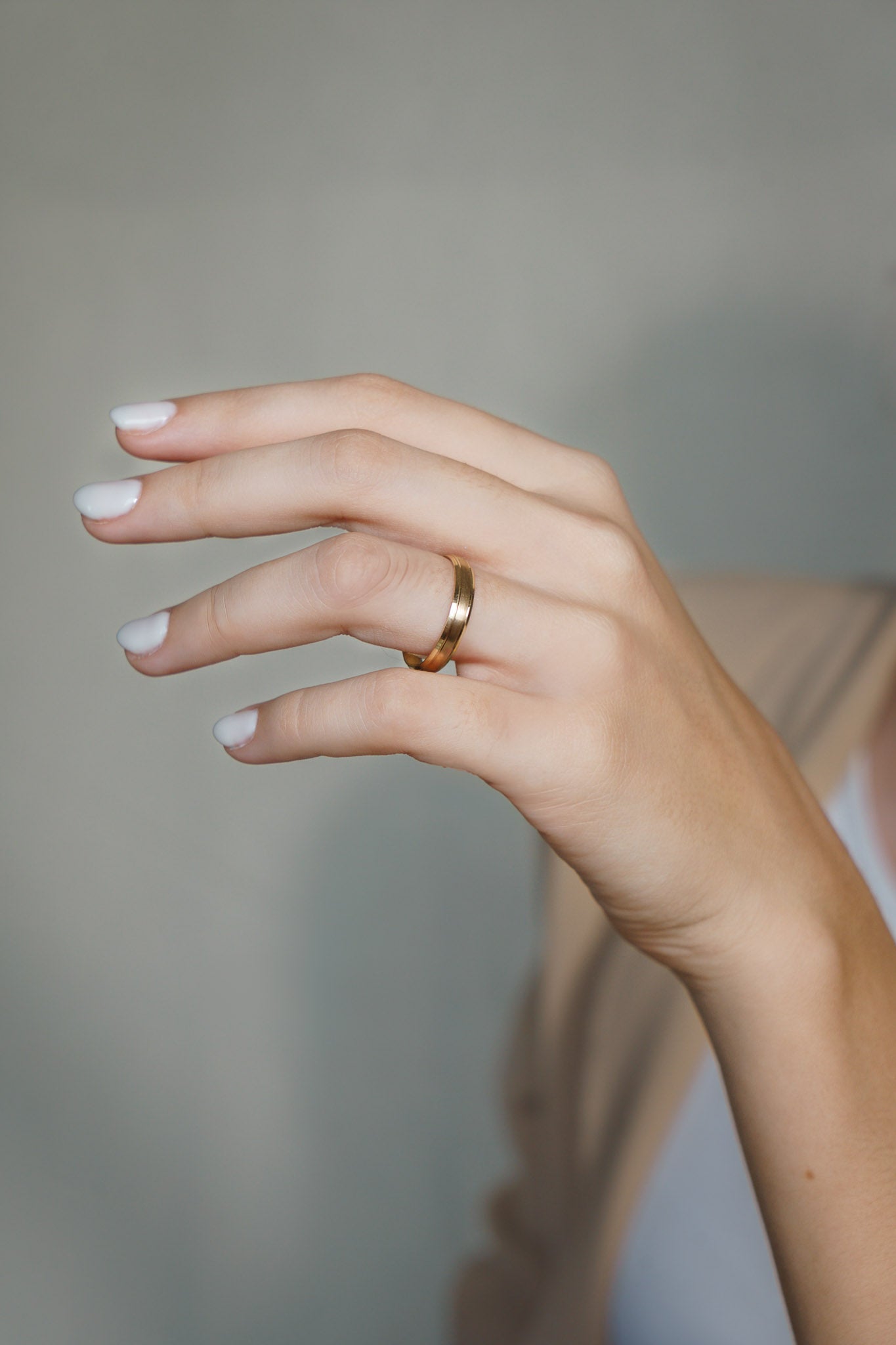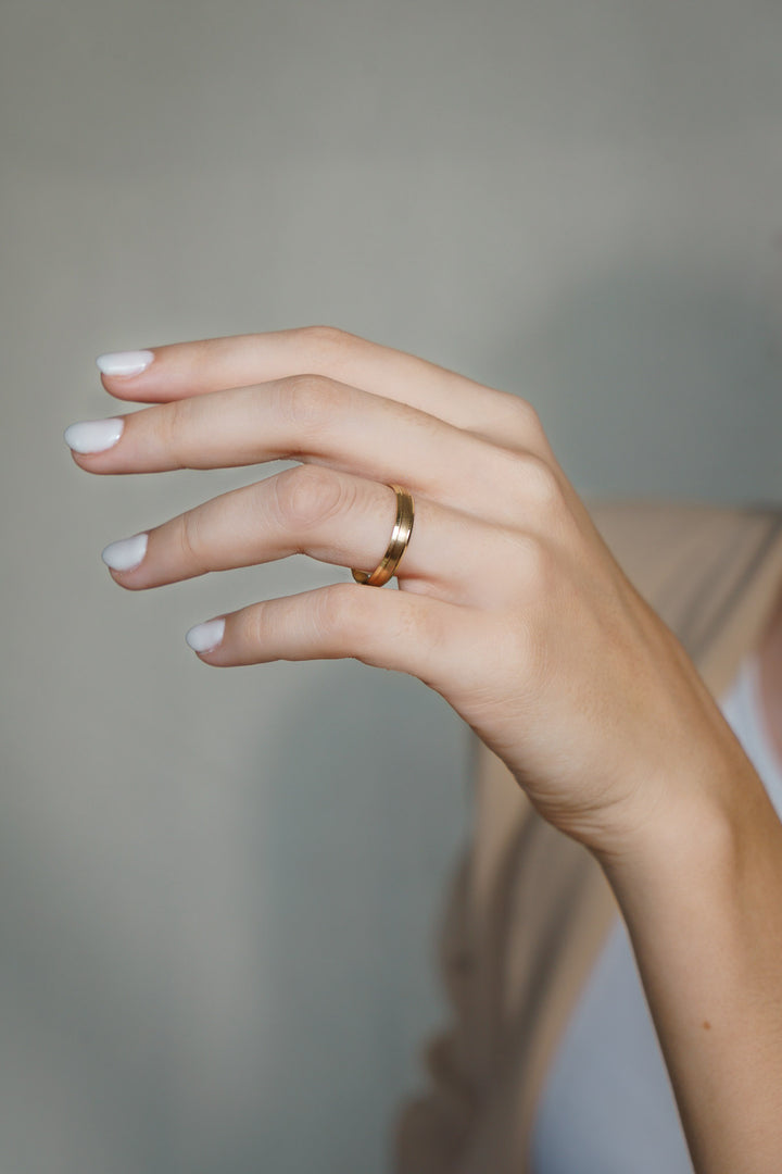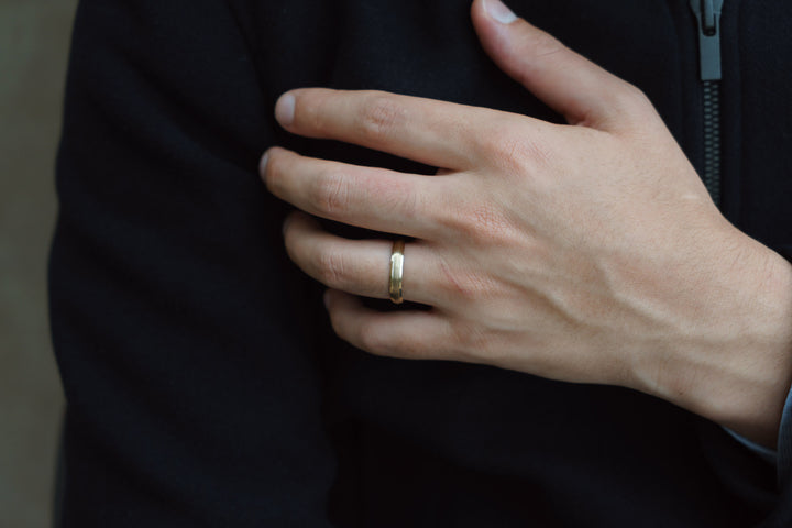 Argolla confort de oro amarillo, con ancho de 4 mm, acabado satinado y bisel liso pulido. Su diseño sobrio y elegante combina la suavidad del mate con el brillo delicado de los bordes, ofreciendo una pieza cómoda y atemporal para el uso diario.