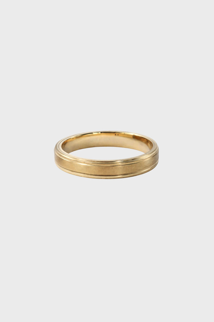 Argolla confort de oro amarillo, con ancho de 4 mm, acabado satinado y dos rayas sutiles que enmarcan el diseño. Su estilo clásico con detalles definidos resalta la calidez del oro, mientras que el interior confort brinda un ajuste cómodo y elegante para el uso diario.