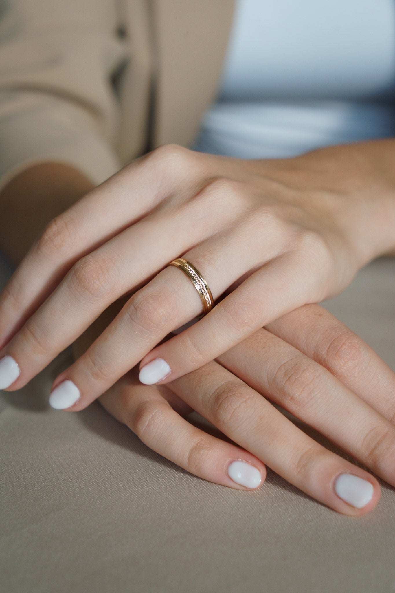 Argolla de oro amarillo de 10K, con ancho de 4 mm, acabado mateado y dos líneas lisas pulidas que enmarcan el diseño. Una pieza de estilo clásico con contraste sutil de texturas, ideal para quienes buscan elegancia discreta y comodidad para el uso diario.